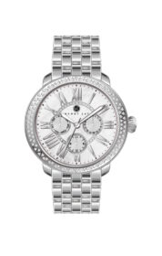 - Stainless steel case and bracelet, domed mineral crystal, mother-of-pearl dial with applied Roman numerals, crystal bezel, multifunction quartz movement with day/date/24-hour sub-dials, luminous Dauphine hands, 5 ATM water resistance.